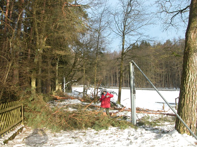Das ist ein erster Schritt, die wenig kuscheligen Geräusche der fallenden Eicheln im Herbst zu beenden. Da merken wir wieder, daß Holz tatsächlich mehrmals wärmt. Aber es ist ein schöner Sport. Auch durch den ca. 40 cm hohen Schnee. Durch den man Holz in der Schubkarre schiebt, weil mit dem Auto vermutlich kein Durchkommen ist.