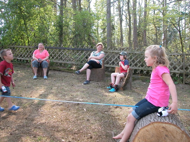 Am Rande sei erwähnt, dass hier die Einstellrolle unser Slackline missbraucht wird als Sitzplatz. Was wiederum die Folge ist von der Besetzung unserer schönen neuen Eichen-Kinder-Stühlchen durch Mütter. Dann müssen eben die armen Kinder woanders sitzen.