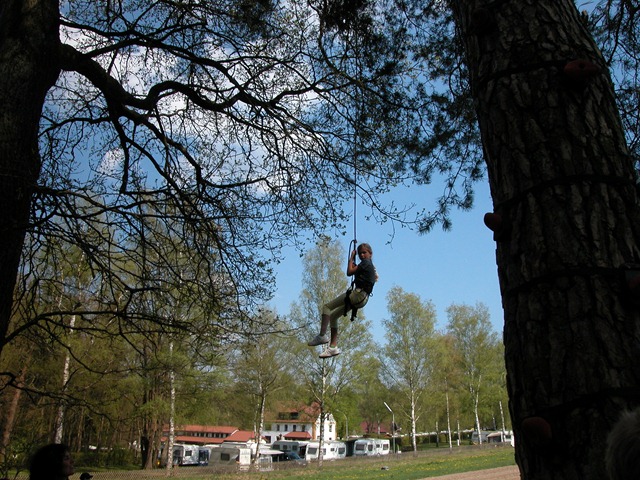 Wer sich weiter als die Hälfte hochtraut, kann beim Abseilen auf dem Ast in ca. 10m Höhe landen. Darauf sitzen oder stehen ist nach dem ‘Loslassen’ ein ganz besonderes Gefühl.