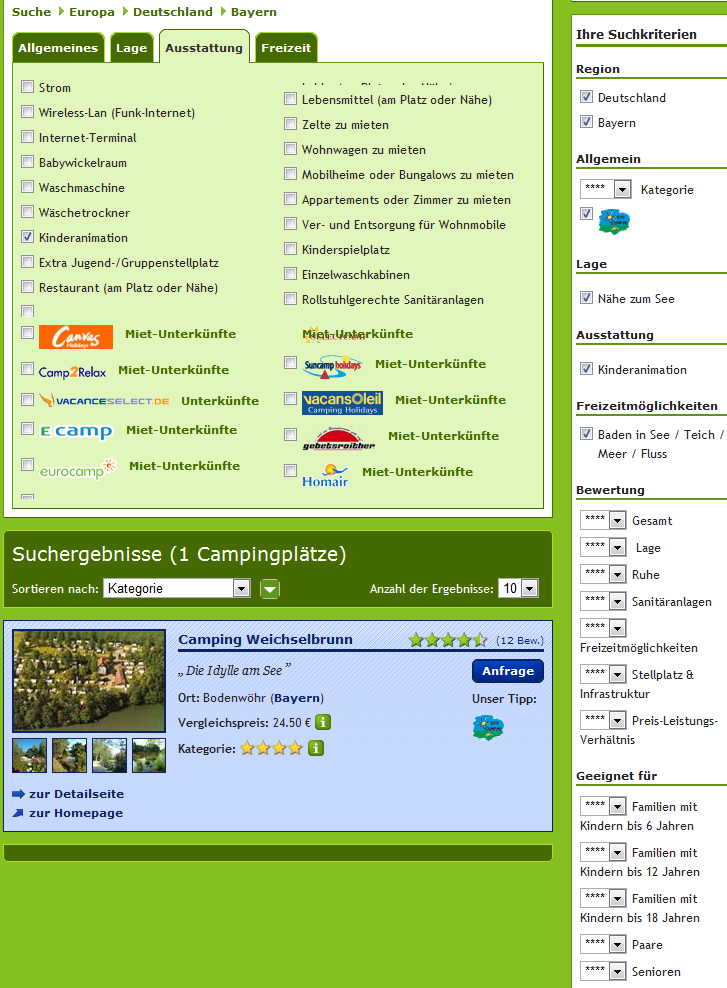 camping.info Einstieg zur Selektion von Campingplätzen (hier kann man die folgenden Kriterien selektieren)