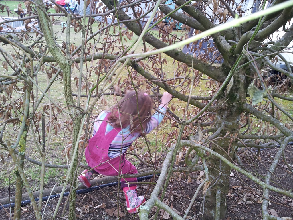 Nach einigen Stunden Steinelegen war Laura dann plötzlich verschwunden. Wir haben sie hier im Gebüsch gefunden, wo sie aus sicherer Entfernung die Baustelle beobachtet hat (links oben erkennbar).