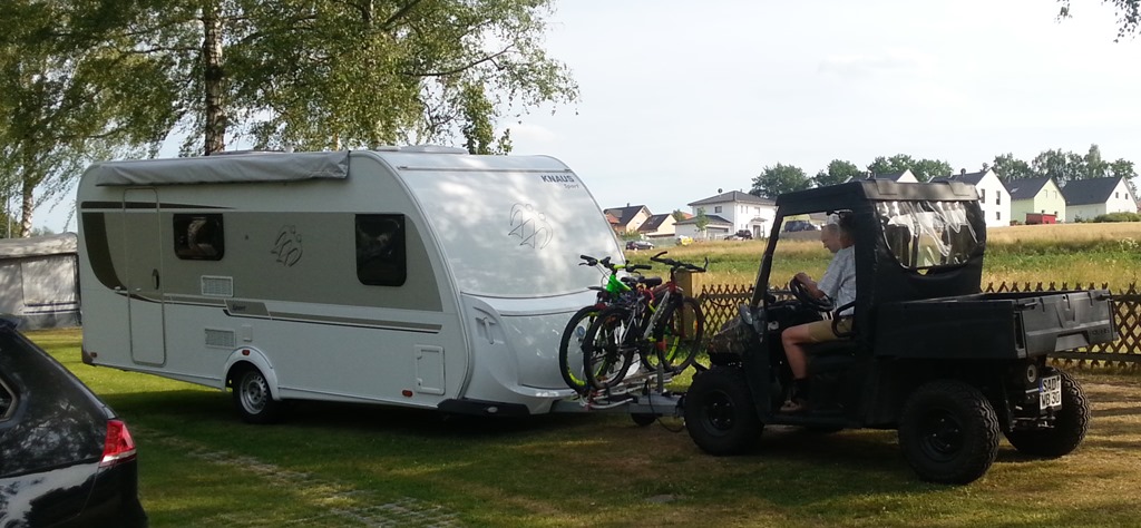 Flüsterleise und abgasfrei auch große Wohnwagen schieben: Dank Polaris Ranger EV mit Frontkupplung geht das auf den Zentimeter genau.