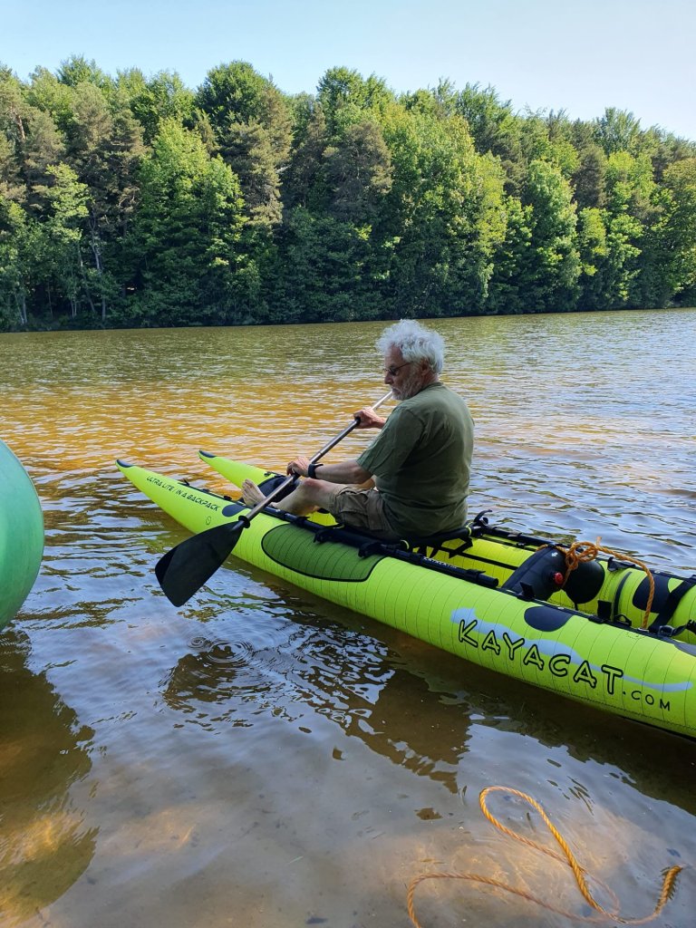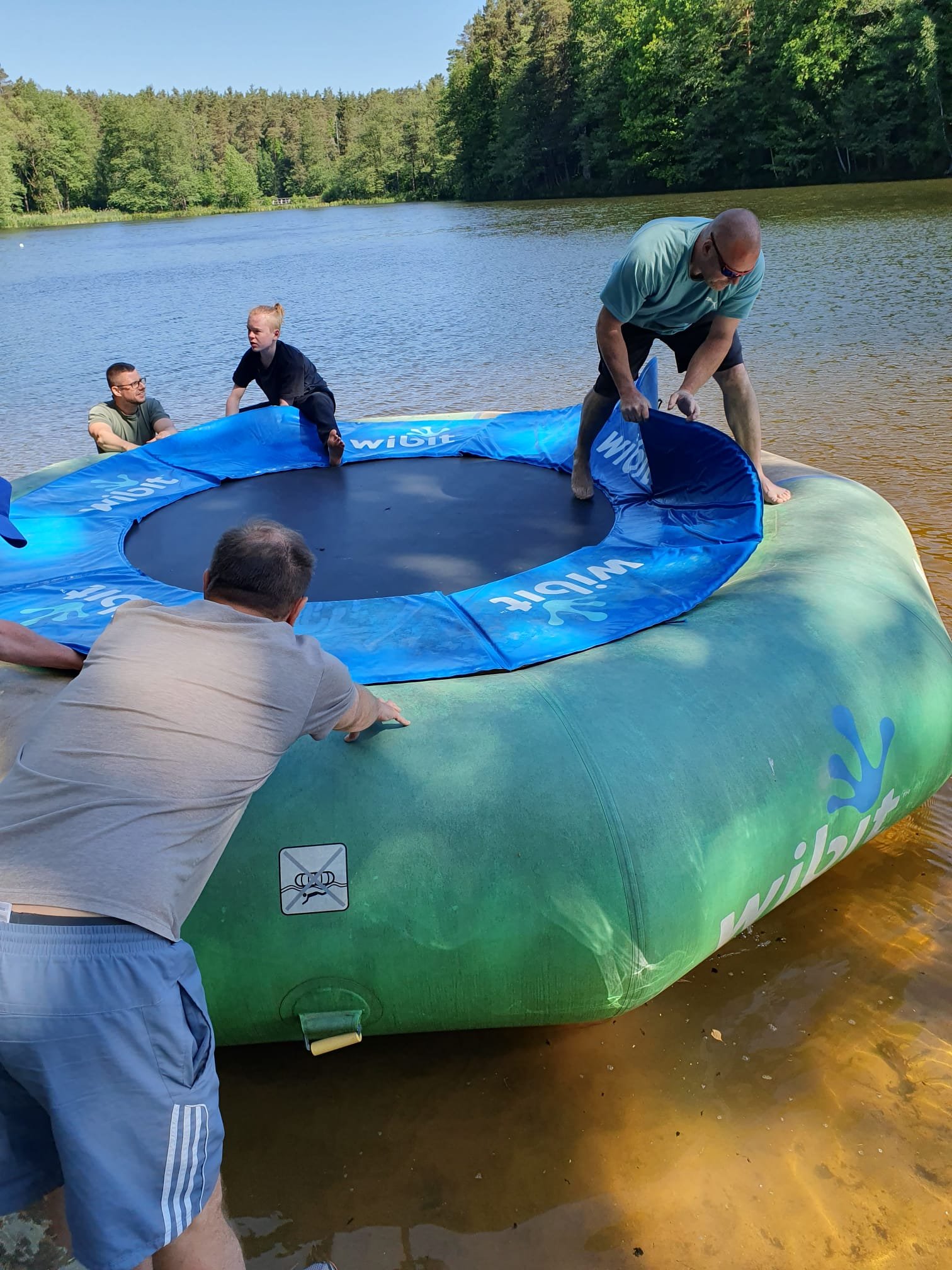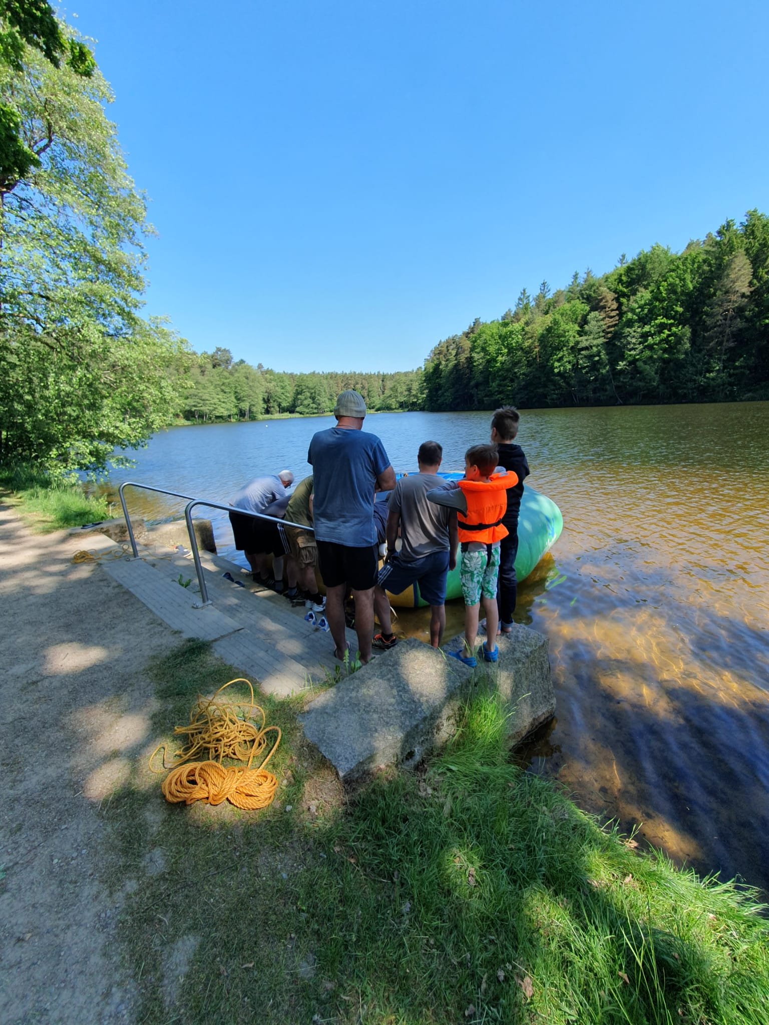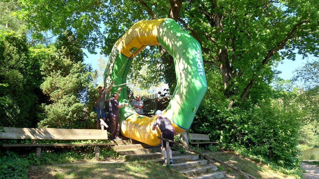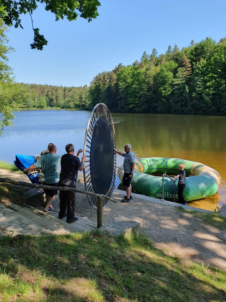 Am Mittwoch 31.5.23 war Wetter herausfordernd gut und genügend Helfer da, unsere beliebte größte Attraktion im See zu Wasser zu bringen.