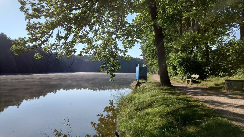 Wenn’s die Sonne gerade erst über die Waldkulisse geschafft hat, ist das Licht am schönsten. Beleuchtet dann sehr akzentuiert das Ufer der Idylle am See.