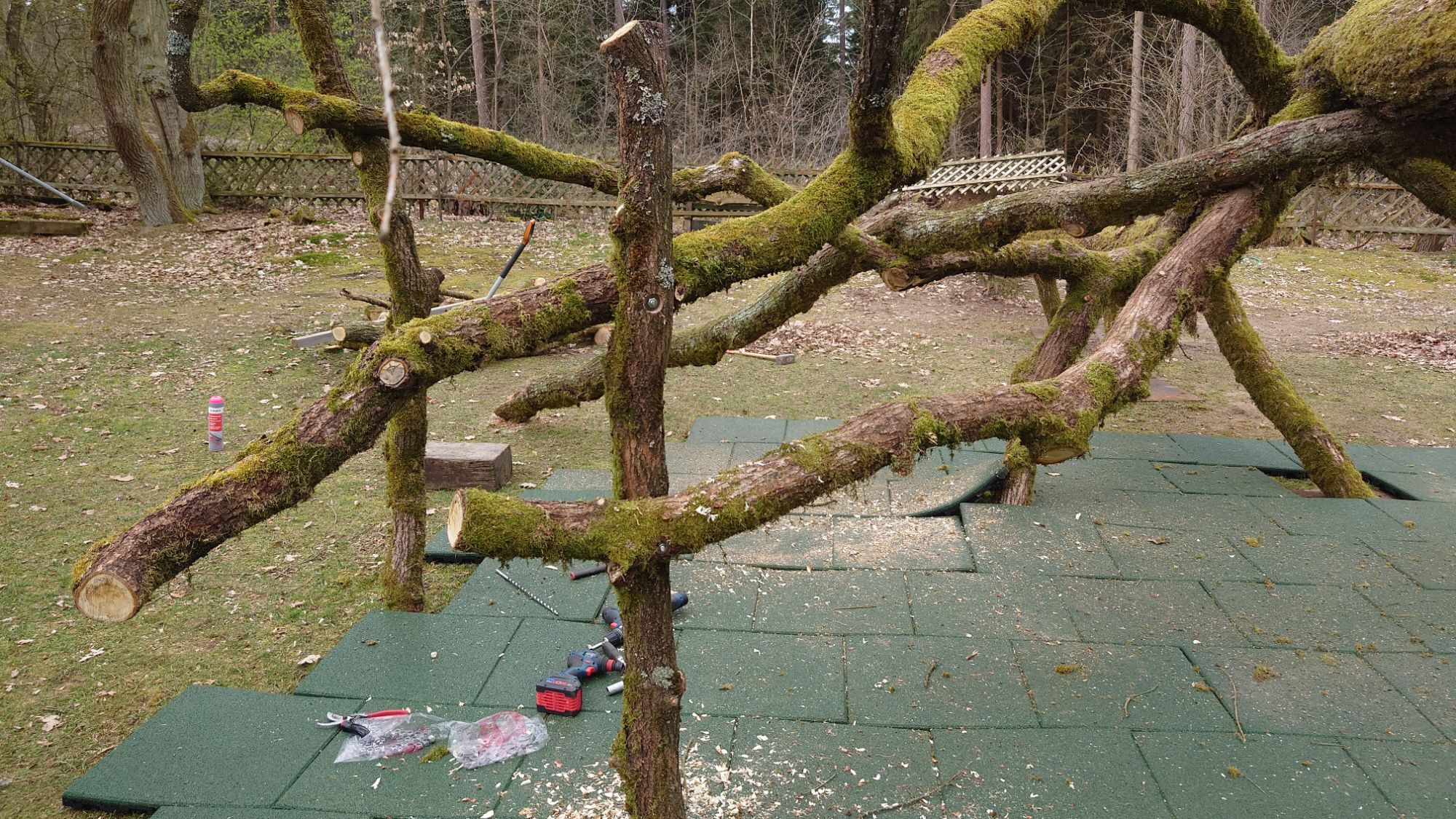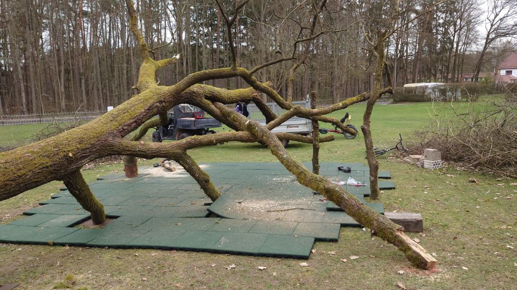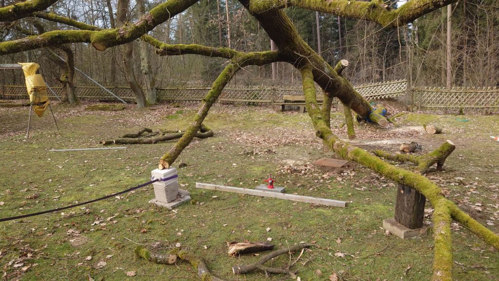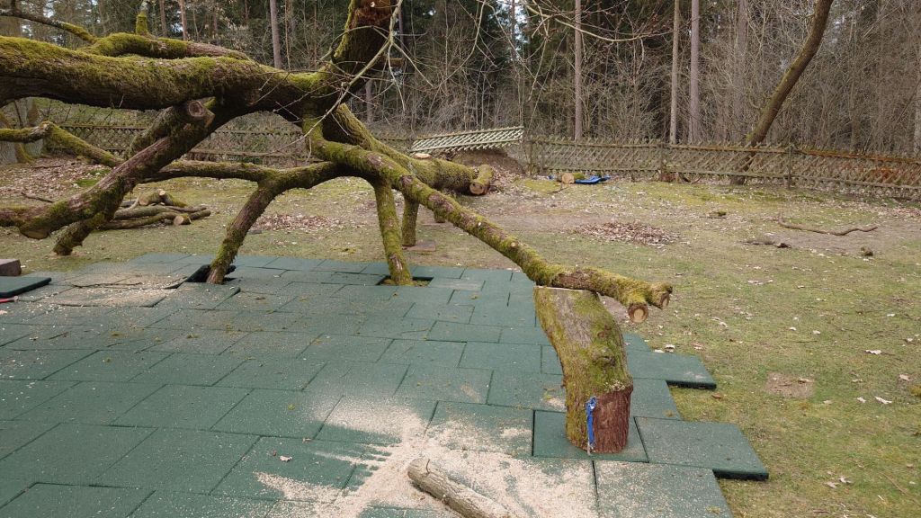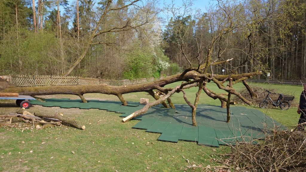 Nachdem aber der hinzugezogene Spielplatz Sicherheits-Profi doch bei dem Anblick nicht ausgesprochen ruhig geblieben ist, kam die Idee, den Baum tiefer zu legen.