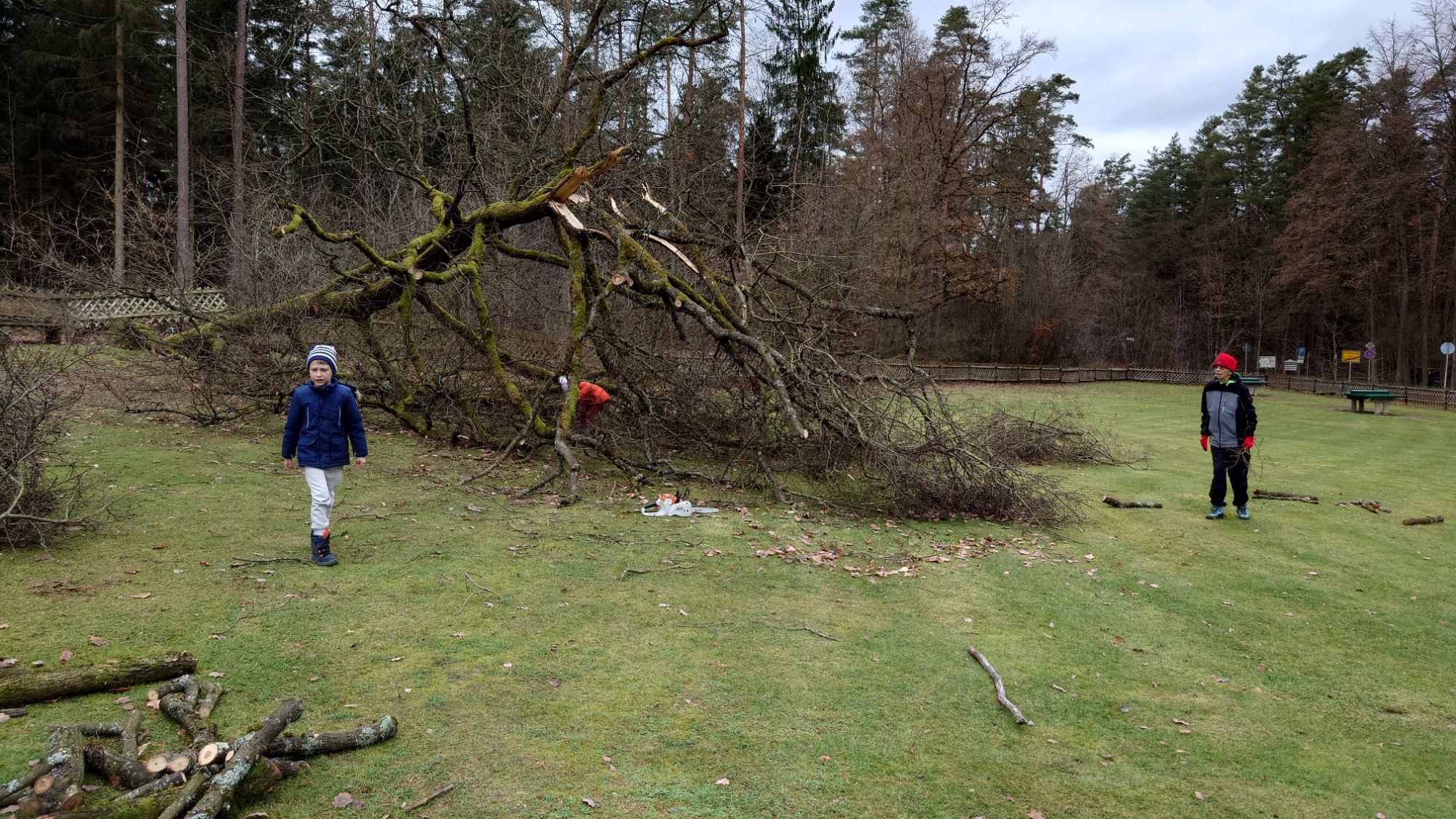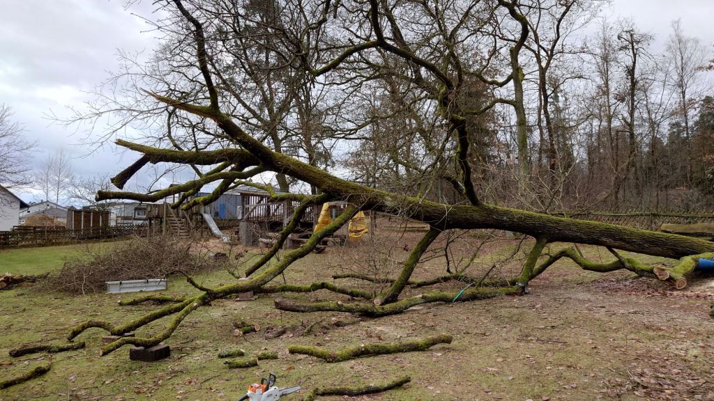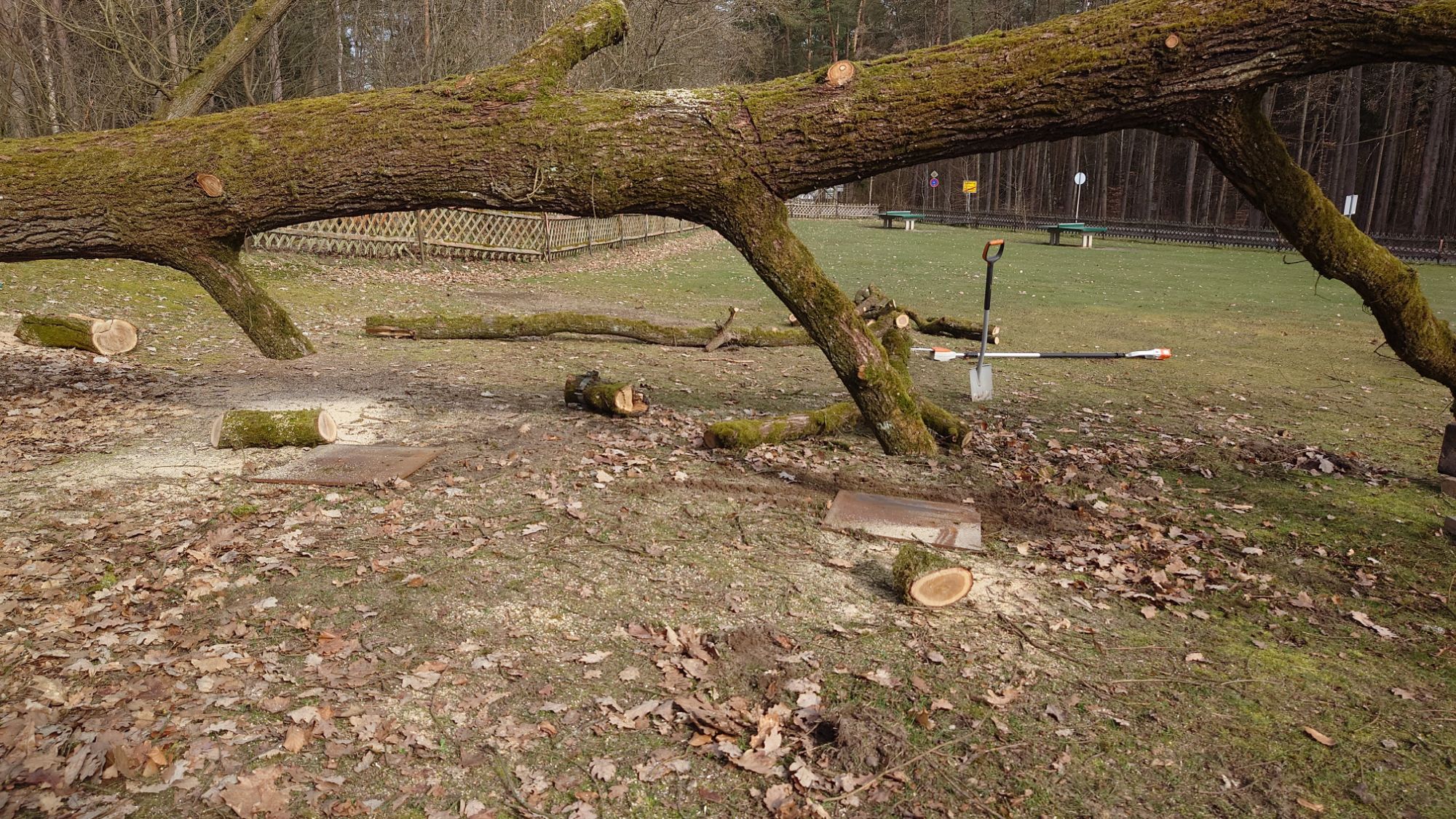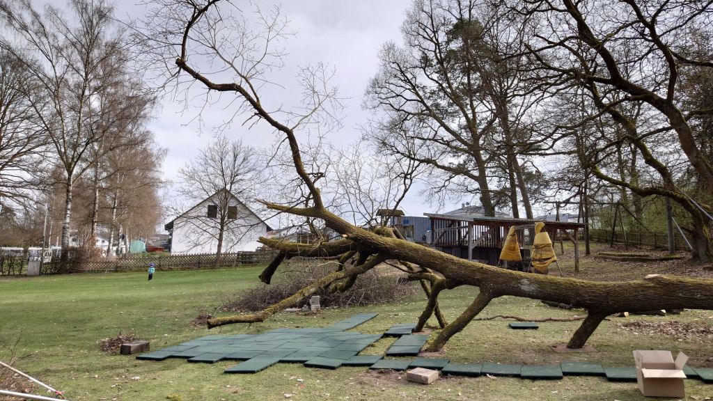 Jetzt ist die spannende Frage, ob der gerade zart austreibende gefallene Riese den Sommer überlebt. und wieviele der kleinen jetzt tiefhängenden Zweige die Kinder überleben.