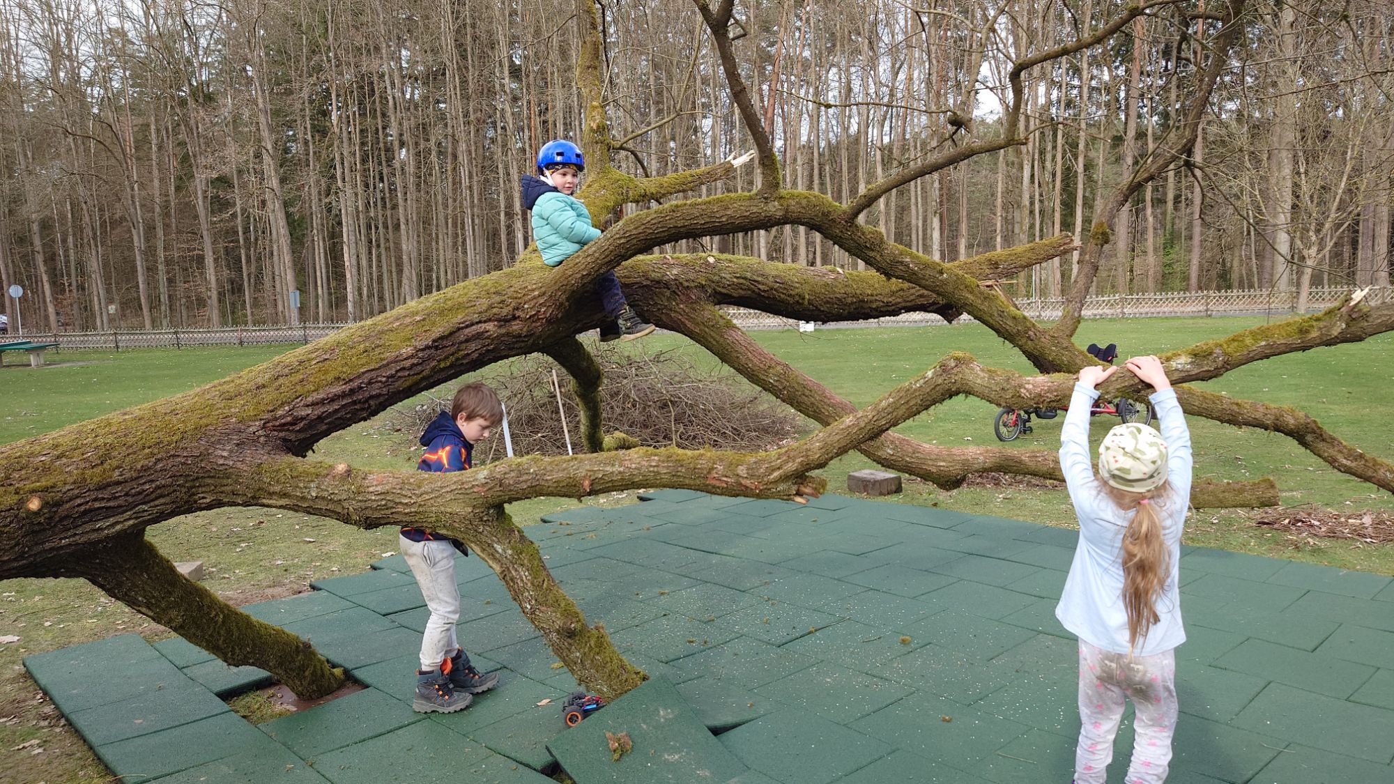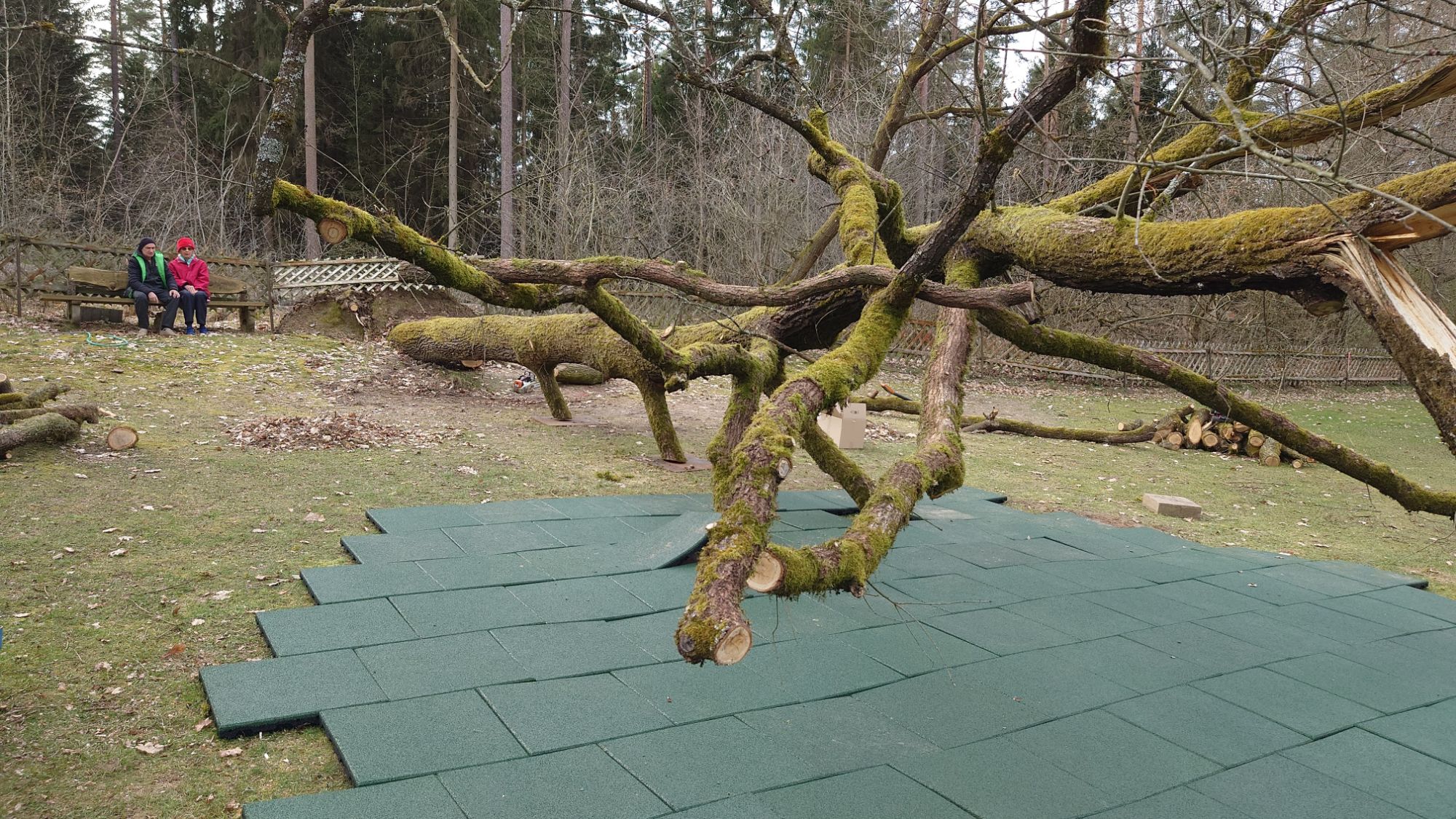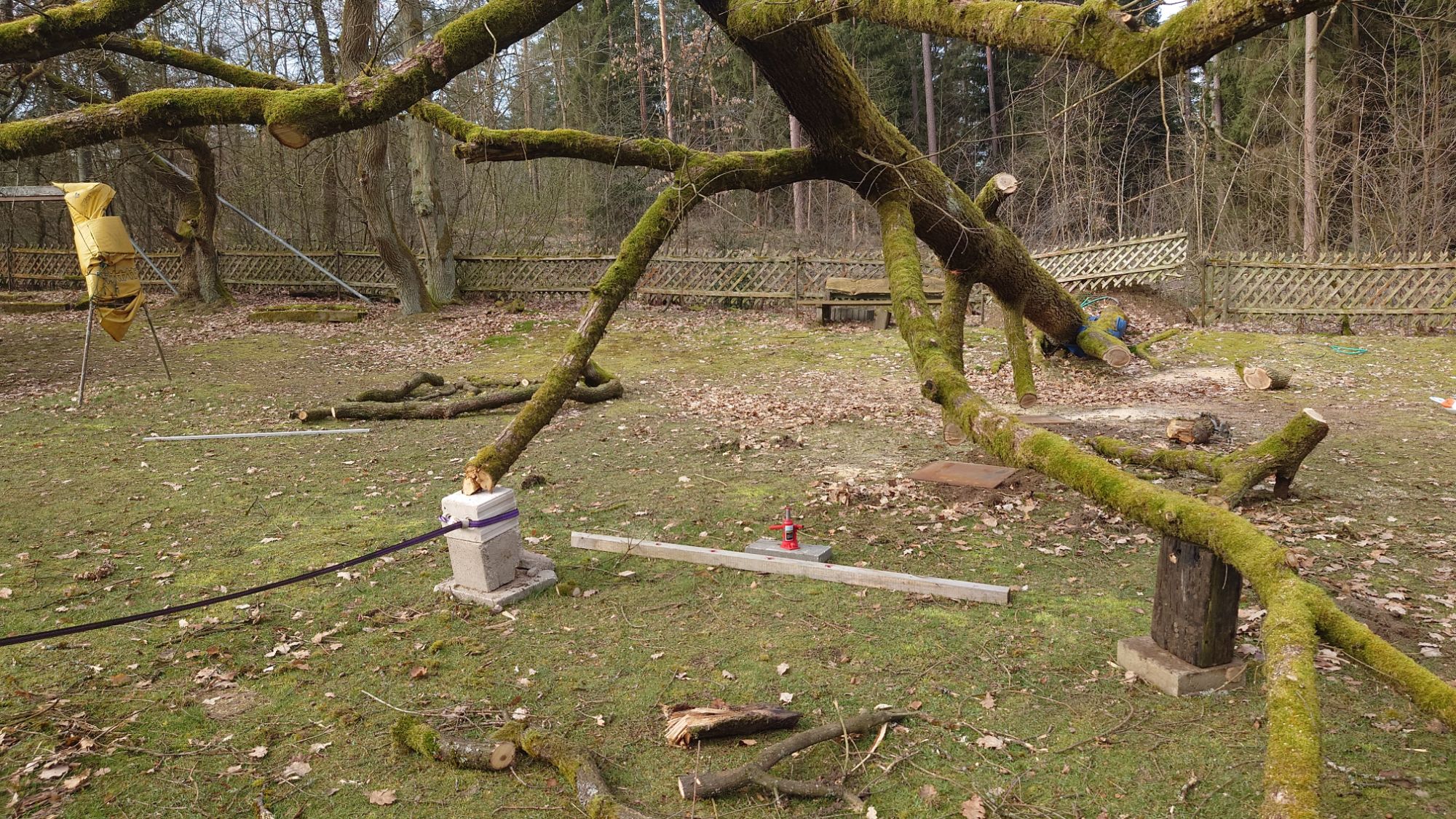 Jetzt ist die spannende Frage, ob der gerade zart austreibende gefallene Riese den Sommer überlebt. und wieviele der kleinen jetzt tiefhängenden Zweige die Kinder überleben.